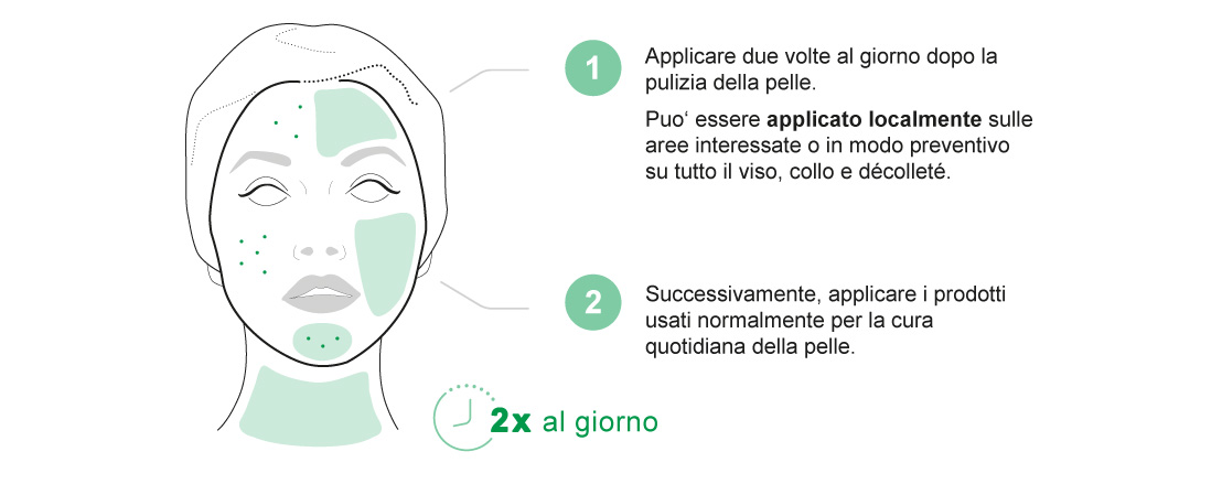 Applicare due volte al giorno dopo la pulizia della pelle. Puo‘ essere applicato localmente sulle aree interessate o in modo preventivo su tutto il viso, collo e décolleté. Successivamente, applicare i prodotti usati normalmente per la cura quotidiana della pelle.